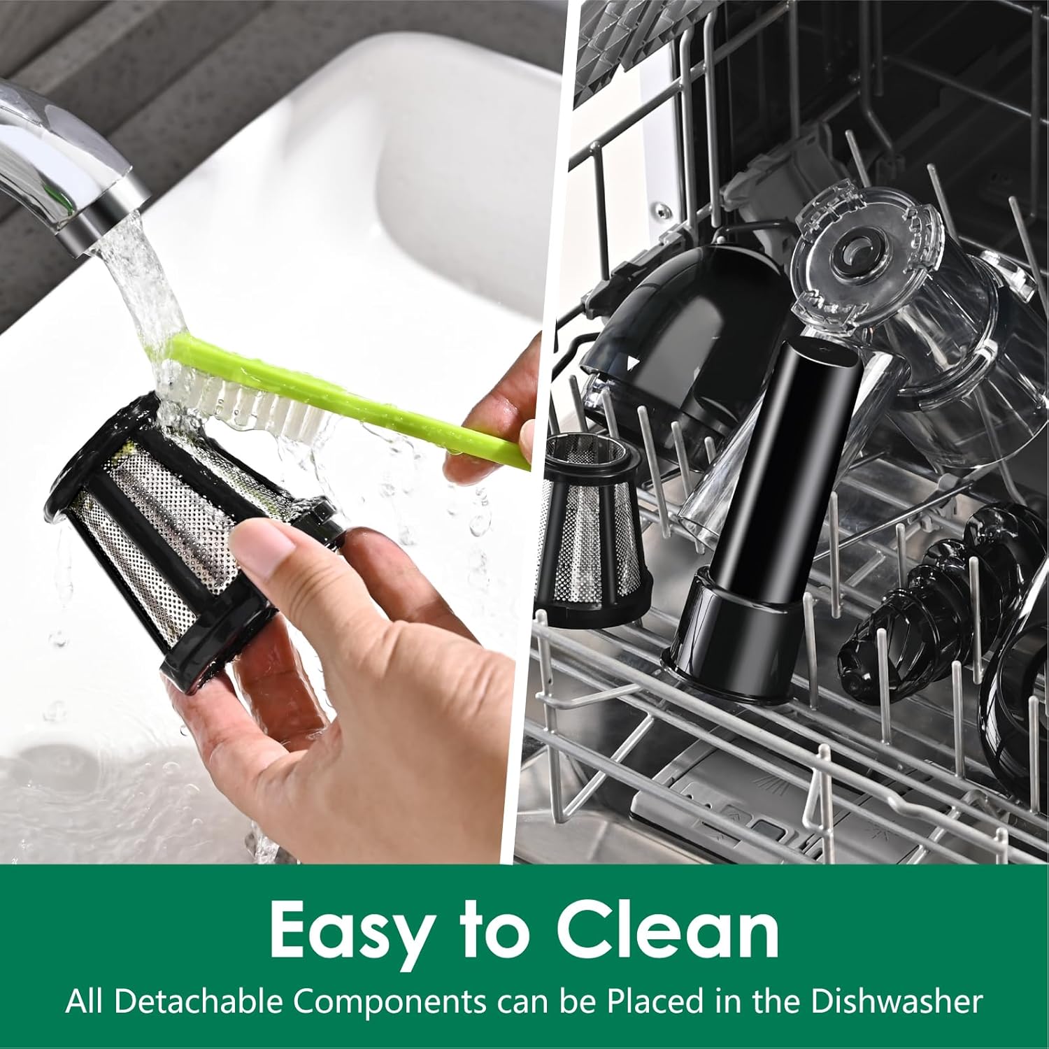- Easy to Use & Clean: Easy to assemble. One-touch Disassemble. Press a button to remove the juicer body simply. We have equipped brushes for cleaning. All of the detachable parts can be sink rinsed with the brush. In addition, all detachable components can be placed in the dishwasher
